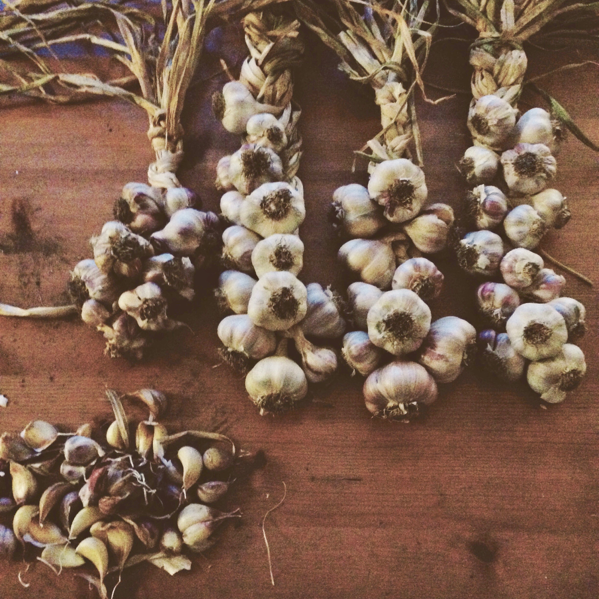 Later I make a vegetable stew and use garlic harvested earlier in the year and hung in the kitchen like giants' necklaces, stored onions, Charlotte potatoes and lots of thyme. I feel very happy watching my family eating it and knowing how nourishing it is for their bodies and minds.