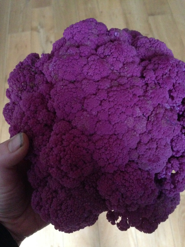 I’ve recently received confirmation that I can take on the plot next to me, which is really the other half of mine. It is very overgrown, but not as badly as mine was when I acquired it, and it has square beds separated by paving slabs paths, something that the plot that I already have did not, and which I had to make. I cover much of it. So now I have all of plot 25. I’m excited and daunted in fairly equal measures. I begin to make plans for an asparagus bed, soft fruit, and more space for everything else. I take a purple cauliflower home for supper.