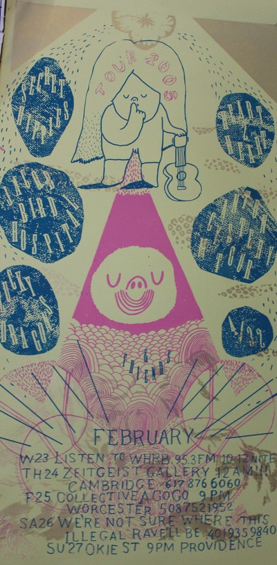 Flier for from Secret Hippies collective tour of site-specific performance. Photo Katt Hernandez, of a silk screen Print made by members of the Dirt Palace Collective, 2004.