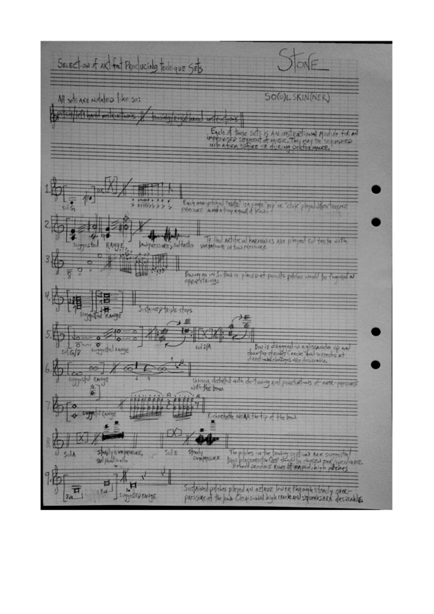 I played with these sounds, and came up with materials, which I sketched out. The score, shown here, was never meant for anyone but myself to see. I used it in the concert at Audiorama, because the materials were so new, and I wanted to physically look at the mark of each recording I'd used while I played, as if I were using a playback mechanism – even though the piece is made for a solo, acoustic, unamplified violin