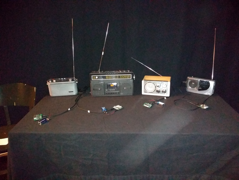 For the SONOTOPIA event produced by the Sound Art as Critical Practice course at StDH in January 2020, I combined some of the lo-fi electronics I'd more recently adopted with transposition work. Four similar field recording montages, set with some processed sounds, were broadcast to four old radios from Myrorna (the Salvation Army's second hand shop in Sweden) with four small FM transmitters, which I then played violin with, alternating between transposition and contrasting materials. [2] Since the performance took place in the School for Radio and Drama, it seemed the best place to try a work with live radio transmission. There is still a radio studio at the school which is connected to the national radio network for live broadcasting, and many of the people who go on to work at Sweden’s national radio and television stations do their training in the very rooms we were working in. So I used tiny transmitters to send signals to radios inside the radio school; transposition of one transmission on another.