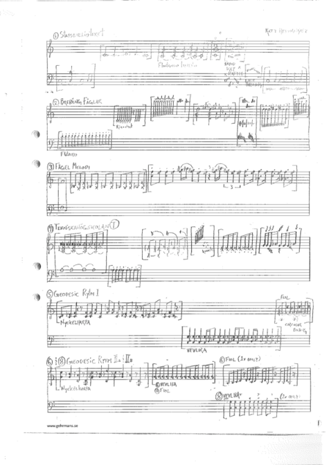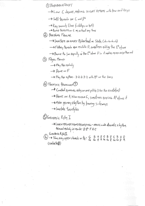 Deuterium is an ensemble of Hurdy-Gurdy, Nyckelharpa, and the F# Scordatura violin I play. [3] I have made three pieces in collaboration with the group so far – Deuterium: Mimer, Deuterium: Dome of Visions and Deuterium:Virkesvägen. It is important to note that the work is collaborative. The score is more of a structure of cues and suggestions, which we then all work on solidifying into a piece together.