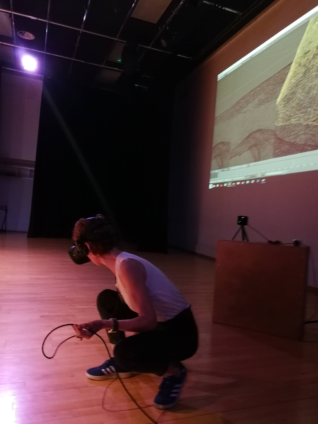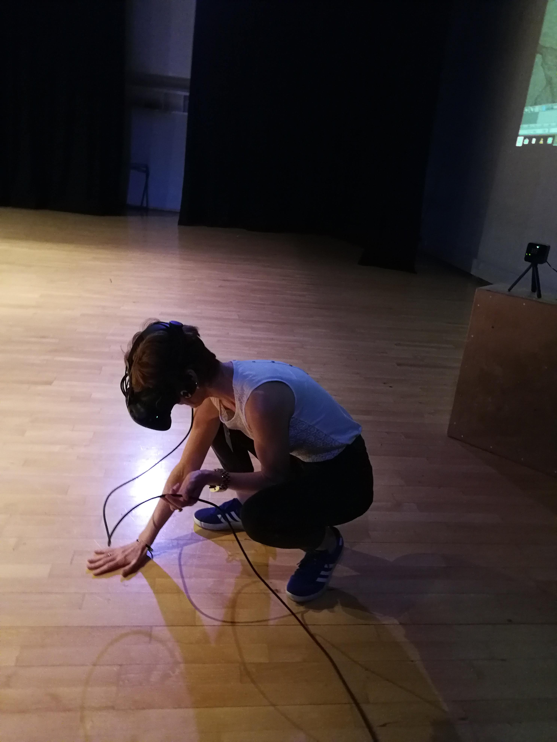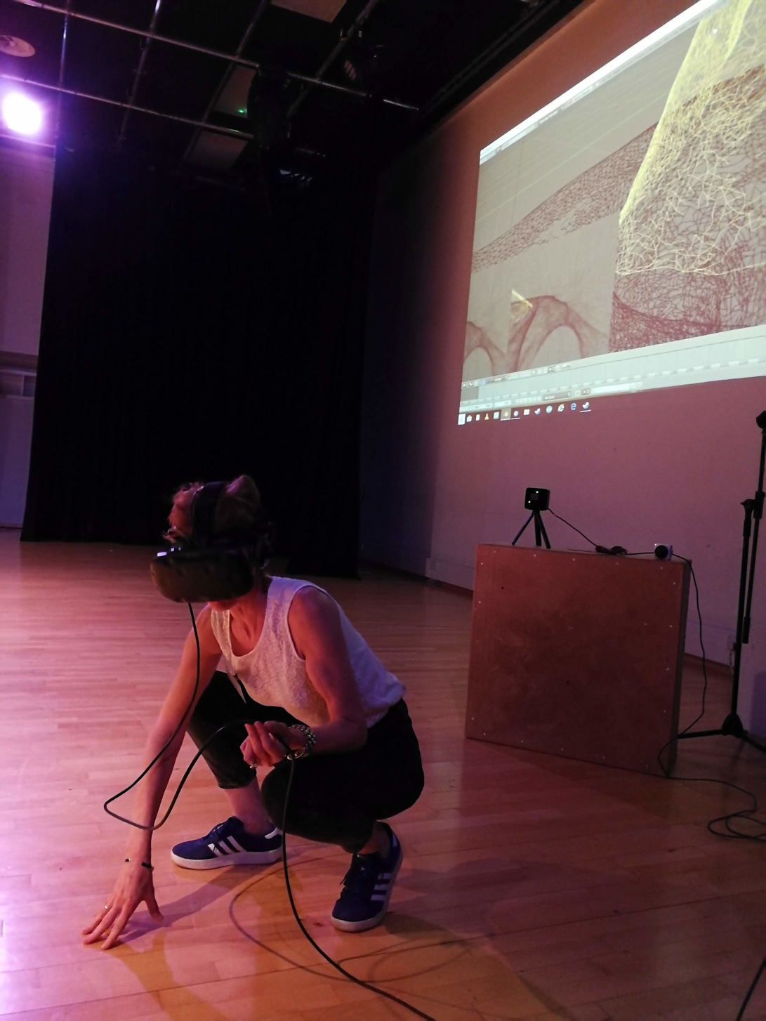 The video above and the stills on the right show two participants in the VR iteration of Imperceptible Dance 2, which included the virtual foot flipped to create a cave-like structure below the participant. This iteration was shown at DMU in June 2018 as part of the CTEO conference that I co-organised with several universities as part of an AHRC/M4C funded project.