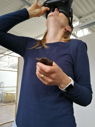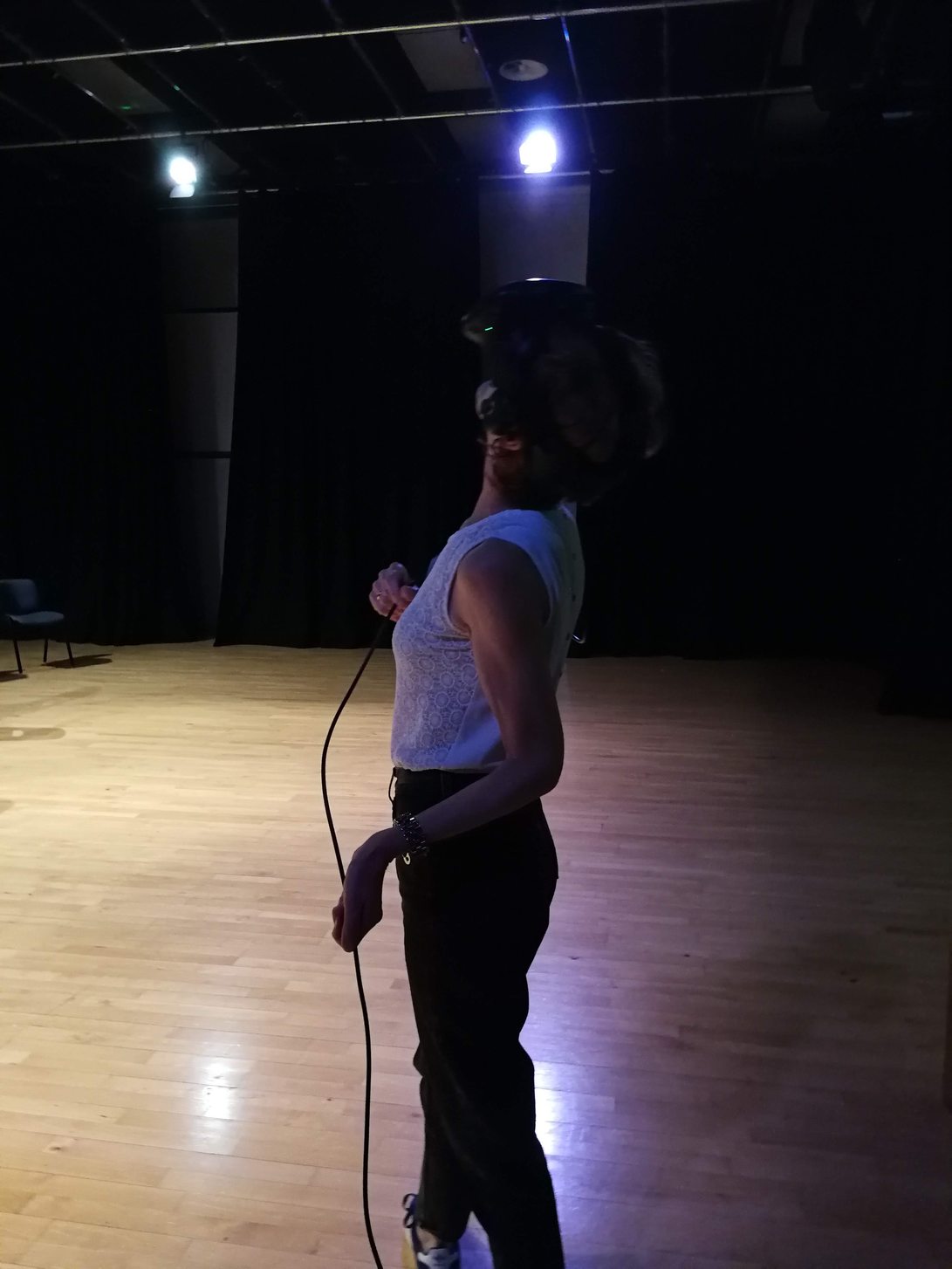 It is interesting to note the different embodied responses by these two participants. Whilst the participant above notes that the grids which delineate the virtual environment make her feel safe, in that there is a boundary to the virtual space, the foot with it's "three metres or so" space underneath gives her a wobble. Ruth Gibson describes this as a "weird giggle" a playful sense of altering your proprioception, your bodily relationship to the ground.