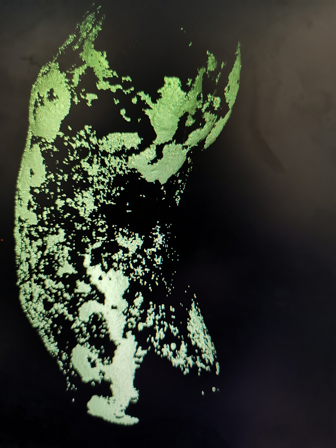 The final videos show the process of Artec scanning, which uses laser Photogrammetry, extracting 3D information from photographs or objects. The process involves taking overlapping photographs of an object, structure or space and converting them into 3D digital models. I am transforming 3D prints, made from bio materials, pine resin, corn starch and sucrose, into 3D digital models.