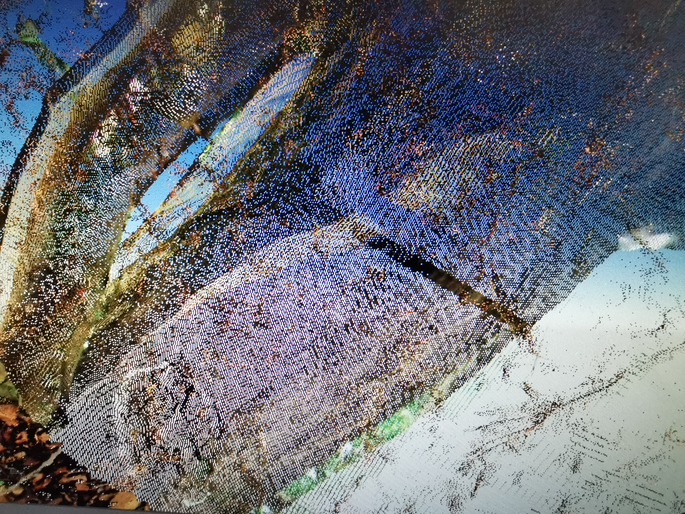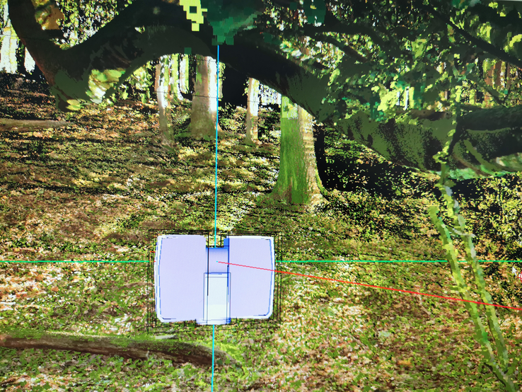 The scan is repeated four times from different angles, to capture the surfaces and texture of the objects, the scanner must compute three checkerboards placed on the surrounding trees to stitch the point clouds together. Each scan lasts 12 minutes, and I have recorded the sound of the susurrating leaves, and the wind in the branches for the duration of the scan.