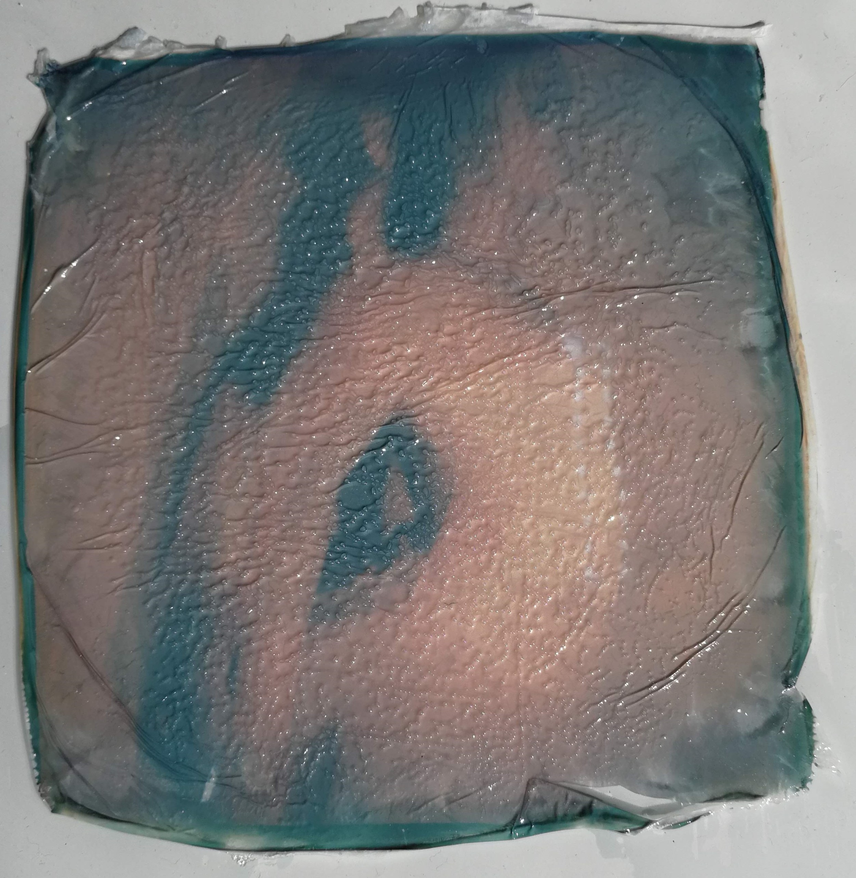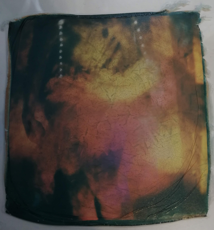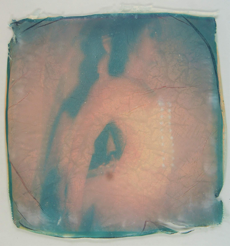 The polaroids shown below, Be-coming, are analogue/digital images of my daughter, again wearing the light corset. The two images show the transformation of the polaroids as an emulsion lift, where I have either lifted the print onto glass or scratched into the prints.