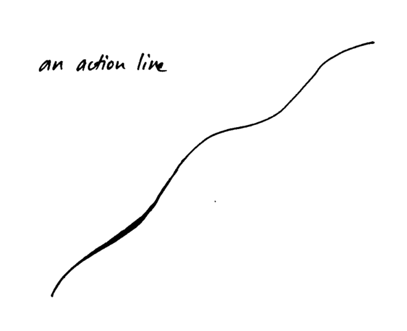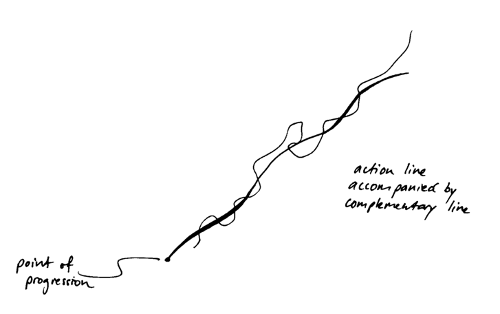 The action line is drawn by a moving point of progression. This point of progression is not steady, but in continuous movement, a circulation, loop or playful refrain. It is in constant negotiation with the surroundings and has no expressed goal.