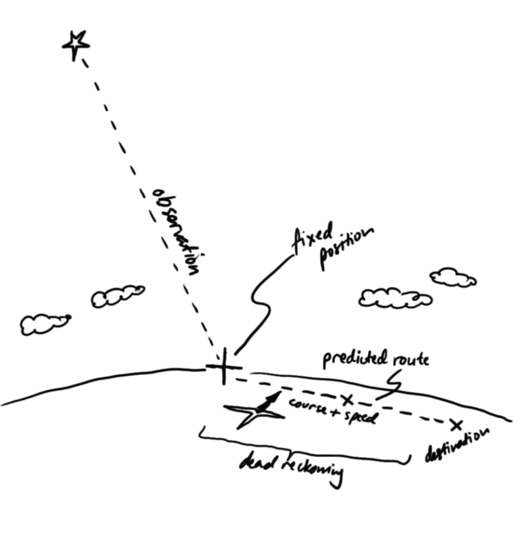 This type of navigation depends on external phenomena in a stable state, compared with the rotation of the Earth. The point of reference is set apart from the position of the mariner, and the further removed they are the more accurate the bearings. The position of stars and the accuracy of time are the meta-parameters with which to fix a position at sea. It is from this geometric situation that the navigator draws out the course ahead by dead reckoning, planning the journey as a plotted straight line towards a postulated future position on the inert geography of the Earth.