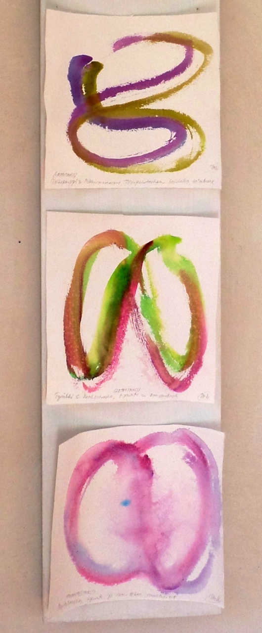 Watercolor series The Bee's Dance Language depicted the communication and navigation of bees. A dance language is the ability of bees to communicate the location and distance of a source of nutrition. In the watercolor series, the colors were selected from the growth of the Cloud Garden and the Harakka Island.