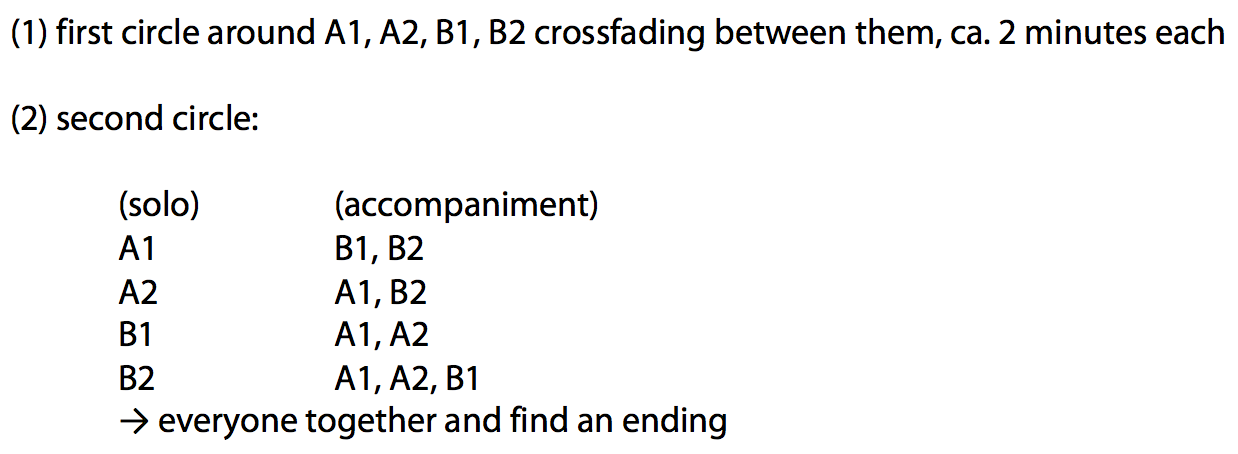 Depending on how time is going by, different variations on (3) can be tried out, like splitting the group into two equal halves and assigning one group to short sounds and the other to long ones (and then swapping the functions of the two groups). This is a strategy I used to use regularly, although nowadays I would prefer not to delimit the “function” of different subgroups of the ensemble in such an inflexible way. Although perhaps the “condition of music” hasn’t yet been reached at this stage, I prefer to keep the situation as non-hierarchical as possible.