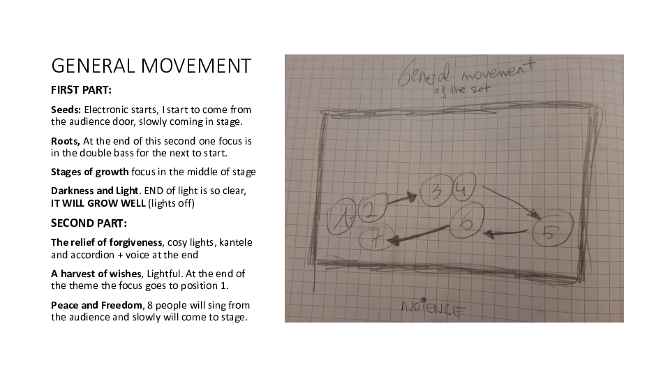 Working with Jukka, the light designer, was as well an important part of the process. I wrote a stage plot (See General Movement), in which I summarized the character and the stage movement of each theme. We met one week before the concert, together with Daniel, to talk about the stage plot and the possible lights on stage. Because it was important for him to listen at least once, we agreed to find more time to rehearse, being the only option to ask for a longer sound check and do it just before the concert. During the last and only general rehearsal on the stage of Camerata, we did practise a few moments that were crucial for the performance: such as the end of Darkness and Light, and the end of the relief of forgiveness, where the lights played a big role.