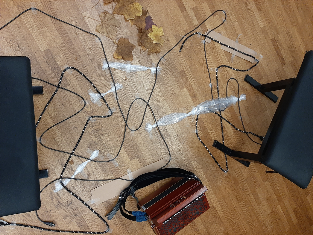 On our first session I had taped different materials on the floor of the room as an experiment for feeling the roots on our feet while improvising (Figure 1.7). Before starting we agreed to only use melodic material, in order to represent visually different roots coming together. We were both sitting, with closed eyes, experiencing the roots with our feet. After the improvisation, we had a spoken reflection where we discussed the experience of improvising in this specific context. Because the roots were connected and we were sitting, it was impossible to follow those roots till the end. This feeling of not being able to reach all the way to the end connected with a reflection on the impossibility to completely reach completly to our origins. Apart from the thinking behind the topic of the roots, these kinds of physical exercises support an awareness of the body sensations and in my opinion its relaxing effects can contribute to a more creative outcome.