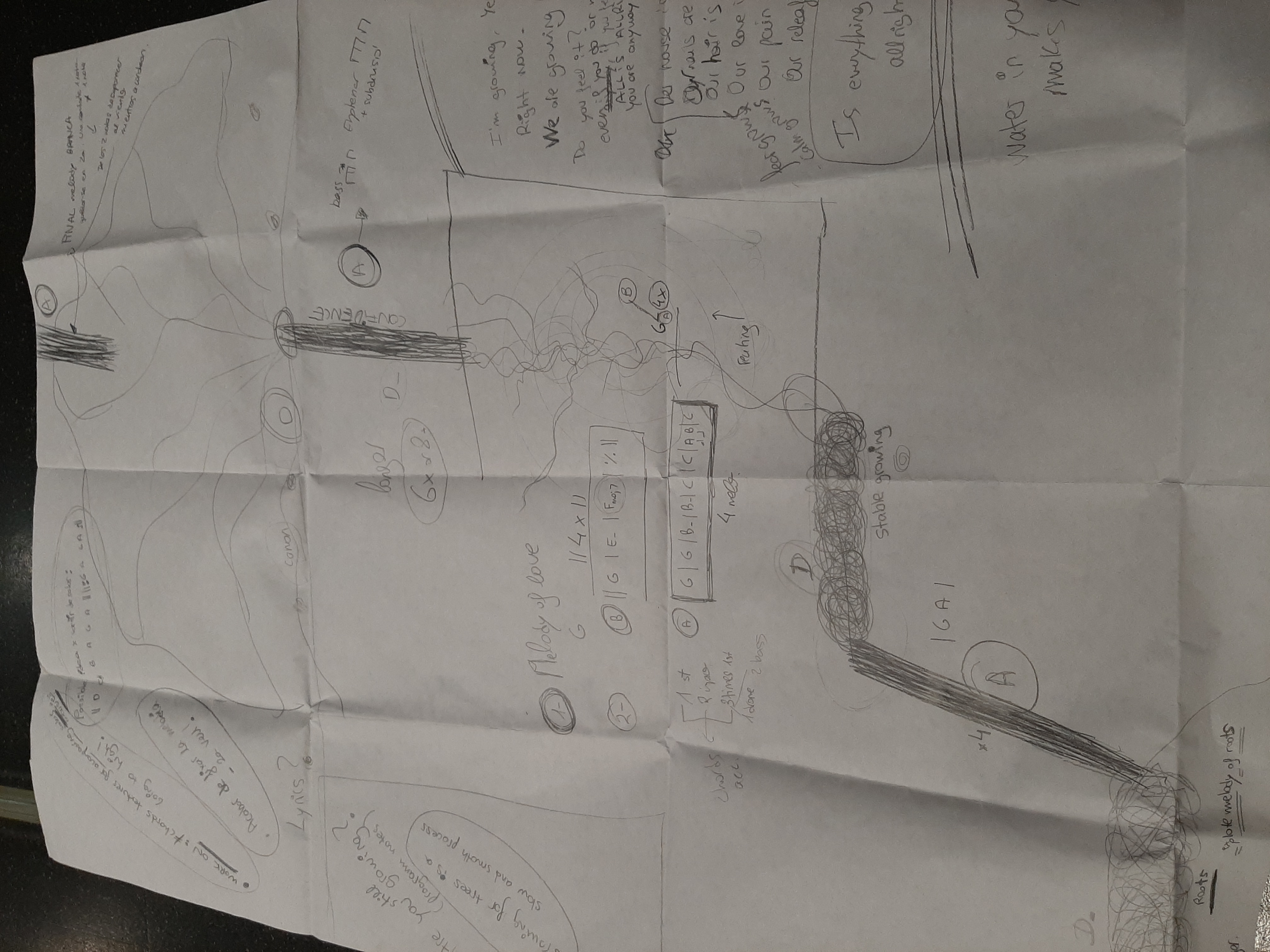 For the second session, I was bringing composed material that was totally influenced by our first session and consequent talk. When I performed it to her, Essi realized the connection with our previous talk mentioning the smooth growing of the musical material that could symbolise the curves of learning. After we practised and worked on the arrangement, we sat down and listened together to the recording. As we were getting really excited on how it was sounding we started to draw a form in a big paper that ended up to be the visual score for our piece (see Figure 1.8). Drawing ideas, forms, feelings, and characters for each part was unexpected and unplanned. Observing the connection of the music with the topics of our early conversation, we realized the power of setting a mental intention present within our creative practise.