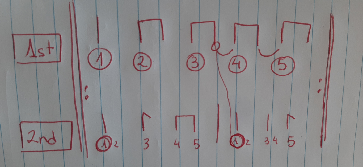 We worked on exploring the two different feels of the rhythm in five of Amaama that was creating the two different textures (Figure 1.10). The first groove was aiming to share memories of a green land as well as respect for the mothers (Amaama lyrics). The groove number 2, defined by the darkness character of the solos, was describing processes, such as unrespectful processes towards the trees and mother earth. (Listen minute 1:00 in the video) And this connects with the two first parts of the first structure (Figure 1.9) while the third one of hope would represent the next part of Light.