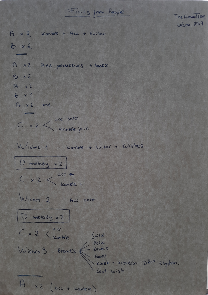 The last practises, with everybody together, were very joyful. Although the structure was almost completed, there were parts of solos that still had to be decided on the last stages of the practises. The Brazilian rhythms fitted very well in the song bringing so much energy to the music. The fact that we didn’t know all of the wishes brought a deep listening connection that definitely affected our musical interaction. The last wish was planned to be the one my mother wrote. She made a beautiful connection of humans and trees and what we can learn and benefit from in personal levels,