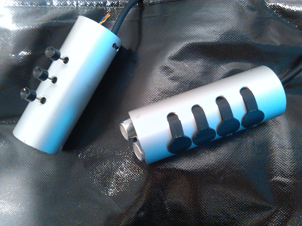 KVSwalkSOLO entailed the specific design and construction of a physical controller for the computer part. One of the two elements of this controller requires physical actions, which are comparable to those used in various forms of traditional instrumental playing, while the other, which is used for controlling the spatialisation algorithm, is manipulated using more theatrical hand gestures. This portion of the project was a collaboration with Lex van den Broek, head of the technical department of the Royal Conservatoire of The Hague.6 The intention here was to create a closer relationship between physical actions and sonic results, considering that this relationship has not always been considered while designing computer music interfaces in the past.