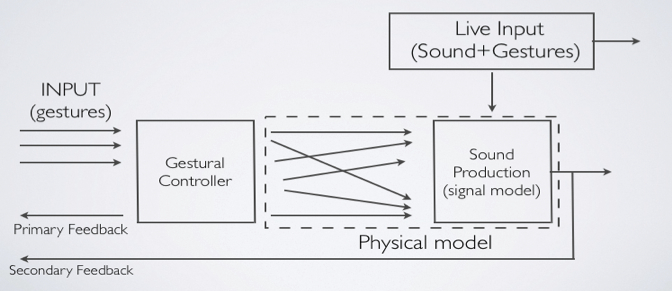I have been working towards adapting both Wanderley’s and my own models of instrument design into musical composition and performance, presenting them as the definition of musicianship in live computer music with the primary intention of collaborating with traditional instrumentalists, both in the interpretation of pre-existing repertoire, as in the performance of new compositions. To do so, I extended Wanderley’s model by adding live-input, both sound and gesture. This is to say, a traditional instrumentalist (e.g., a violinist) interferes in the model of the digital instrument, rather than the other way around.