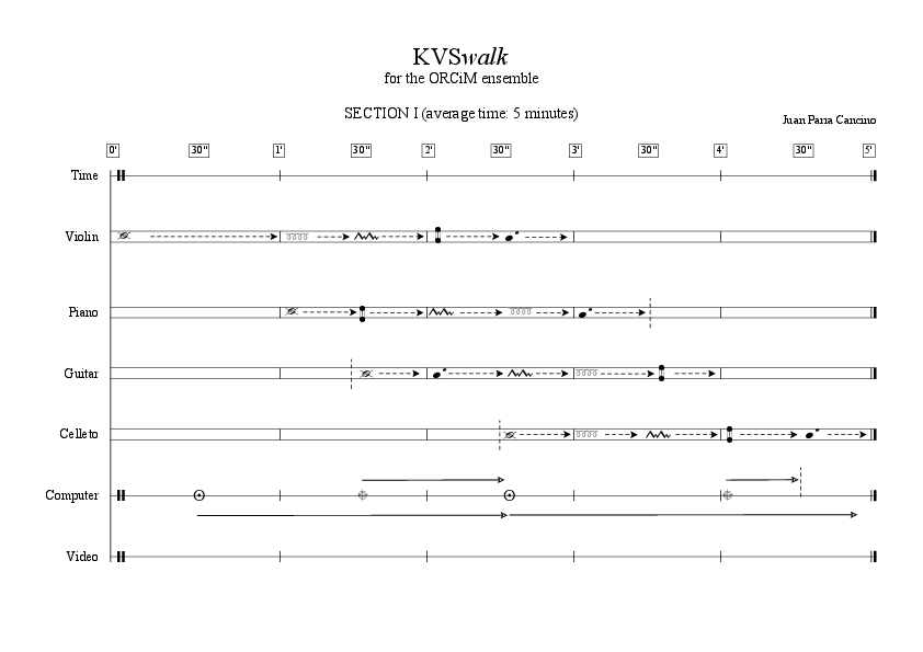 After having described the five gesture groups that constitute the basic instrumental material for KVSwalk, I will now present the five layers that together formed the structure of the piece. The final version of KVSwalk contains five layers of musical information, each of which responds to a different approach/experiment/exploration of a particular notion of embodiment.