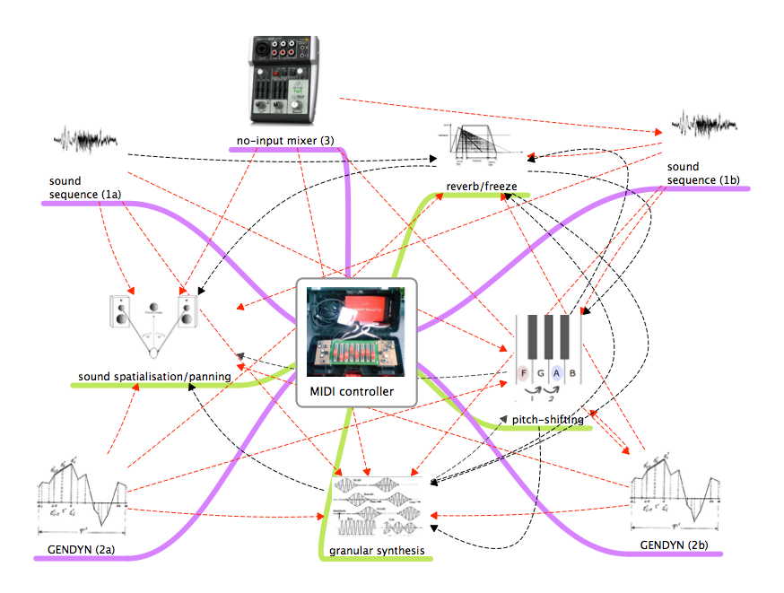 Each of the sound sources communicates with the others through a sound manipulation engine, which affects its sonic properties directly and provides control information for the sound manipulation of each of the other sources. An exception to this connection is the external analogue mixer, which only provides control information to the other sources and does not receive control information from anyone other than the performer. The engines of sound manipulation are: