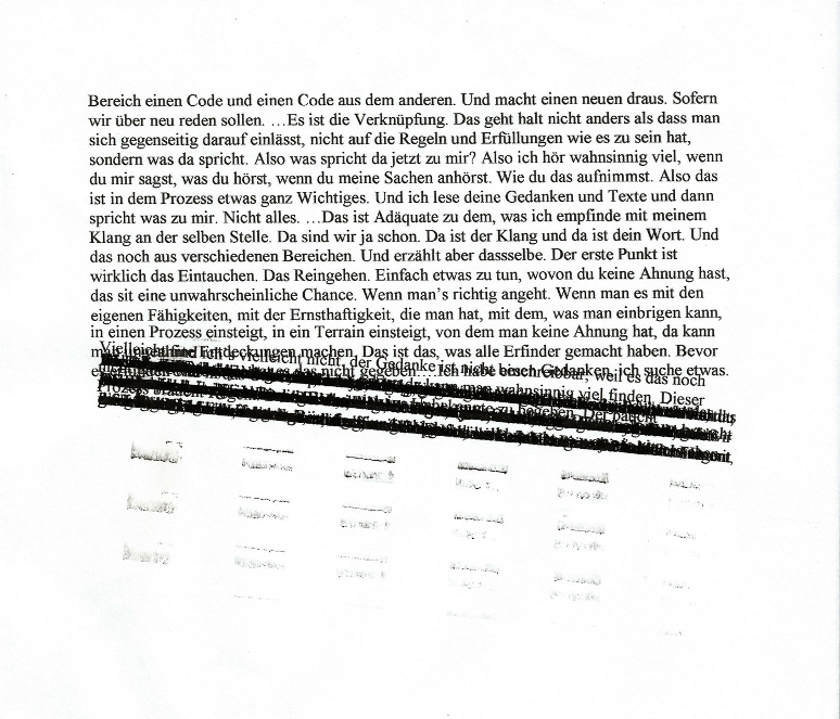 On the one hand it was important for me to ’play’ the diagrm as a score. To interpret the notation most presicely. To follow the given lines. On the other hand I aimed for the largest possible absence of intention in my interpretation through sound. That means: not to think much about why I select which sound with which electroacoustic manipulation in which tempo. I followed those intuitions as disciplined as I possibly could.