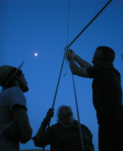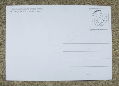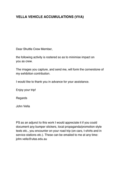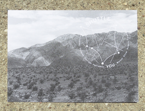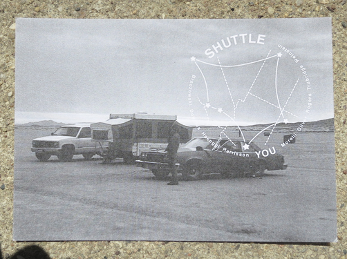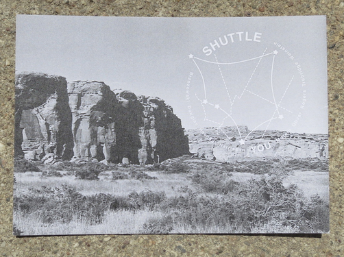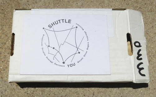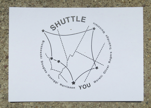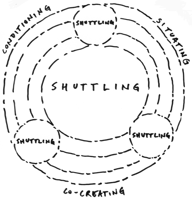 Shuttling what begins as a ruse, or perhaps a scripted McGuffin. Shuttling: a signifier and a collective undertaking without imperative, simply a vehicle for that yet to be determined, a promise of passage in a state of mobility and a gathering of energies.