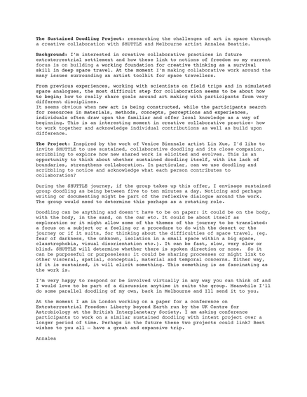 Shuttled in a sustained doodle, back and forth by Annalea Beattie’s question from the outset: ‘If you were an artist travelling in a shuttle into space what kind of artist toolkit would you take with you? What would you return with?’36