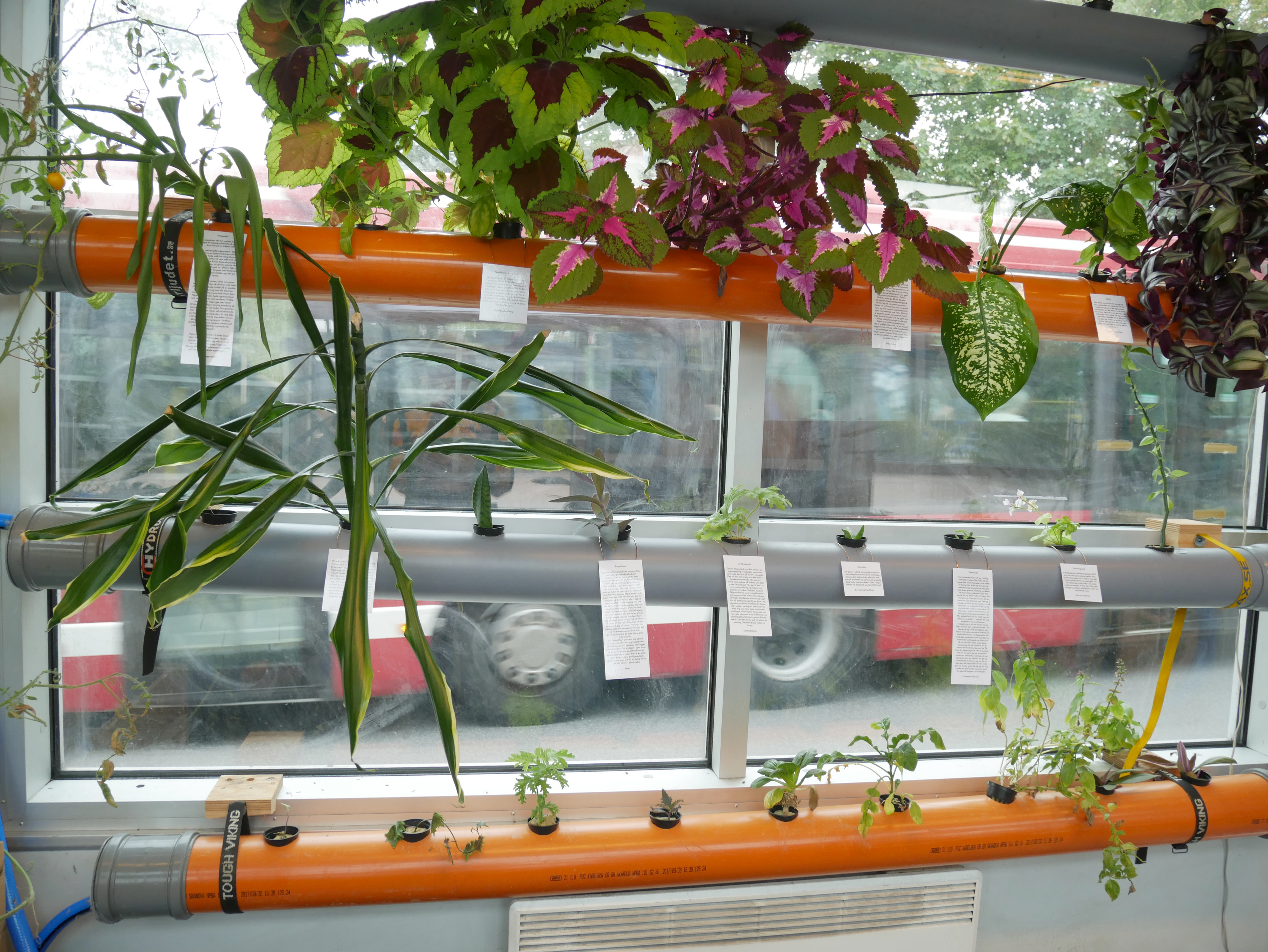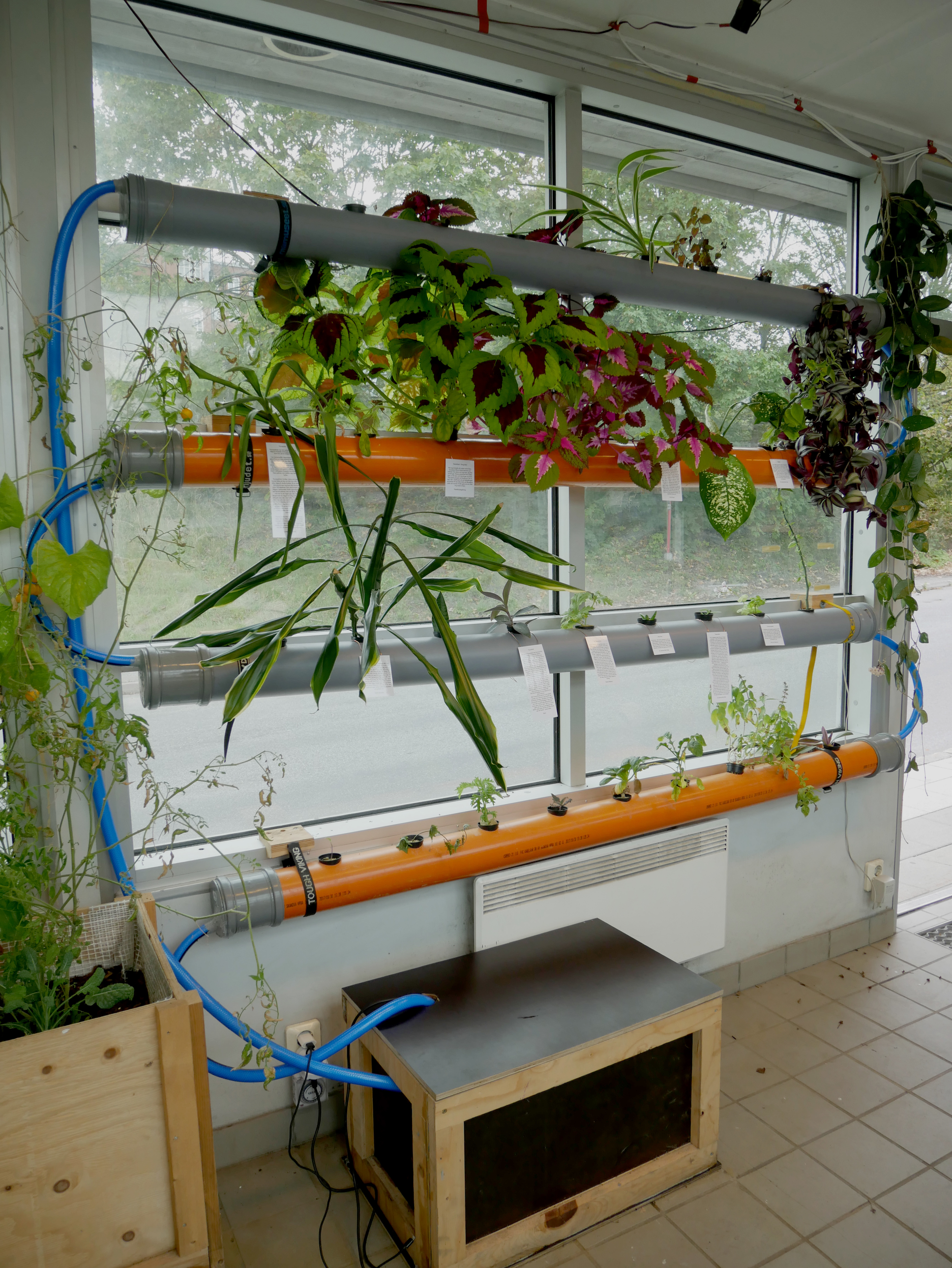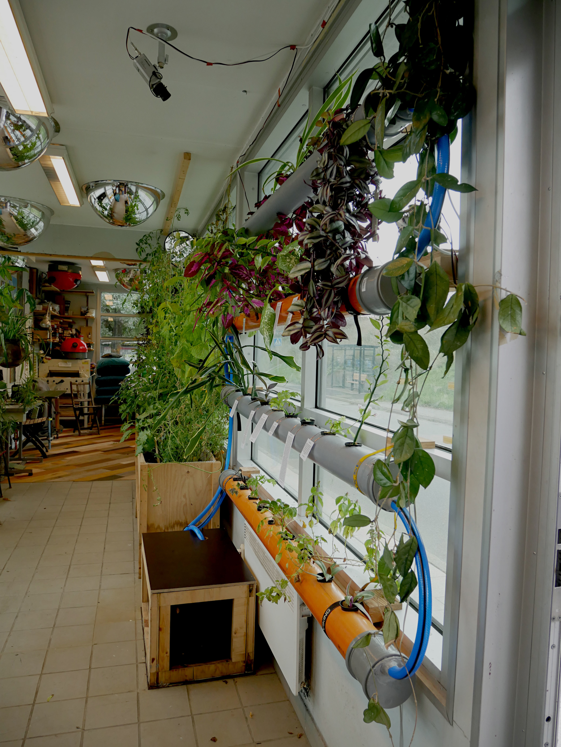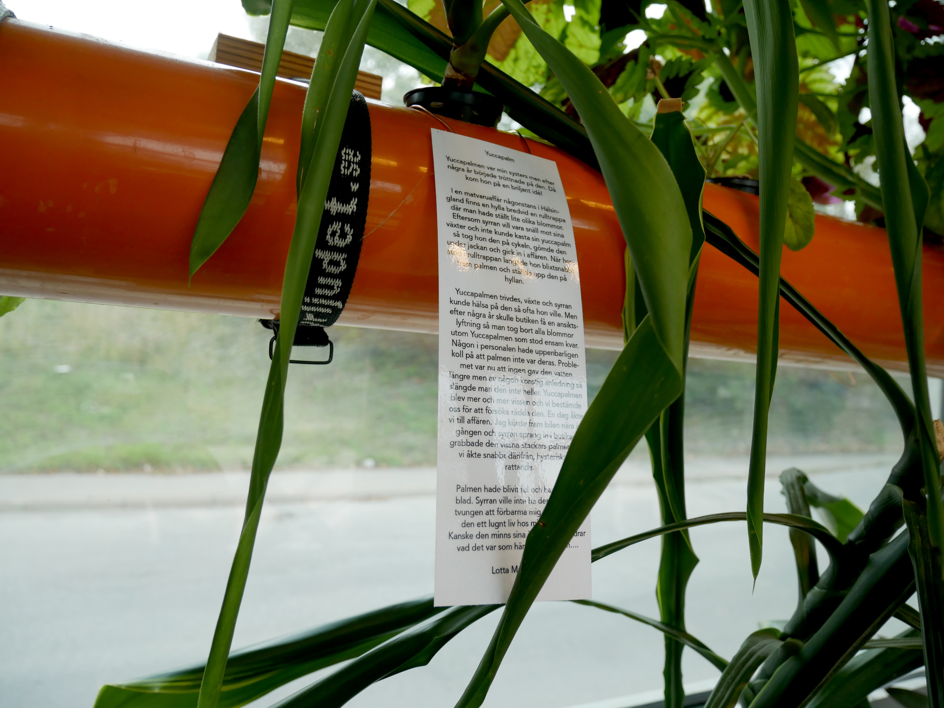 An abandoned bus stop that Sara and other artists have occupied. The bus stop was remade into a greenhouse in which Sara has built a hydroponic system. This project focuses on ways of living with nature in a city, combined with the memories that plants have accumulated through generations. Plants are able to change their behavior and learn. They are able to remember past experiences even in long term (for example a long cold winter). Plants have been moving with humans during all times. Are they a part of our collective memory, can they teach us about our history and future? The cuttings in the hydroponic system have stories, memories from the owners of the “mother plants''.