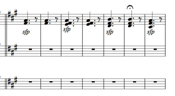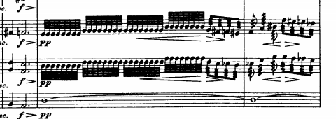 It can be found that the string only plays the role of the background in this part. Combined with the adaptation method of the upper tremolo, it can be changed to the figure like this Which shows that it has a short break between the last half-beat of the first bar and the first beat of the second bar. This short break can easily emphasize on the first sound of the violin in each bar. This is another way to express “spf