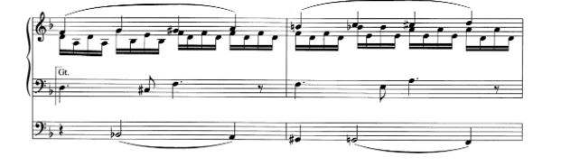 In this section, the right hand corresponds to the part of the violin group in the score, which retaining the melody course direction of the highest part, and the reason why the lower 16 notes alternately from d to a instead of a to d is the third beat. If from the bottom to high (d to f), then the d and g sharp will become an increase of four degrees, in order to avoid this situation, the editor will choose from d to f.