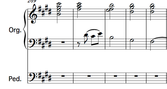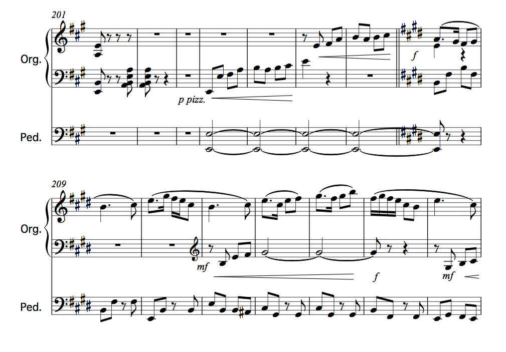 There are eighth notes in the score. According to the actual performance, string instruments playing pizz. sounds shorter than eighth notes. In order to ensure the effect of playing, so that the keyboard contact time should be the same with the orchestra score (eight notes length). For example by using detaches to play the note. Because according to the organ sound, the lower the sound zone, the retention time should be longer. We cannot ignore the reason that how to make the organ have sound.