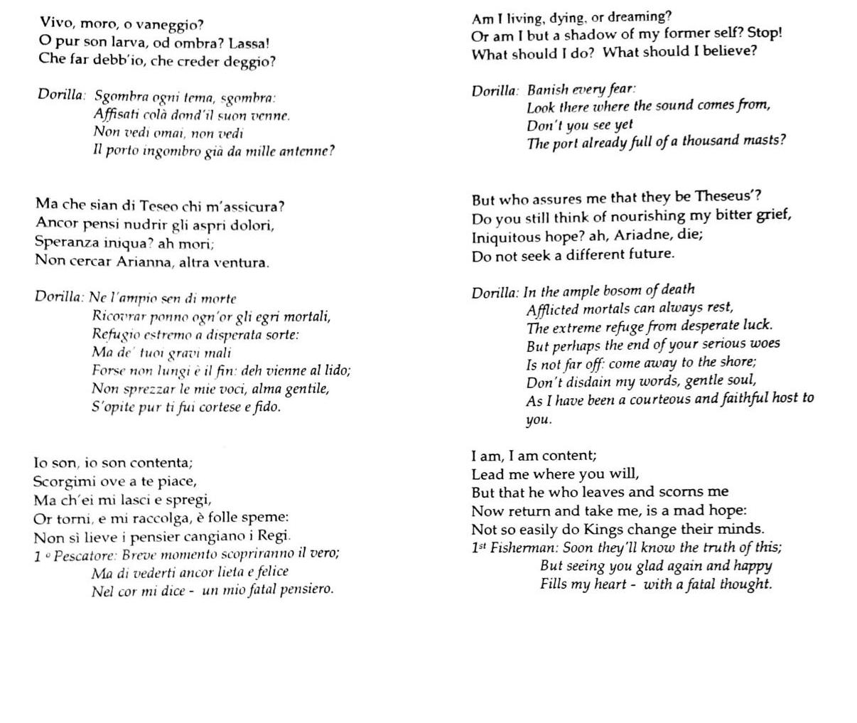 Ma che sian di Teseo chi m'assicura?.../...Non cercar Arianna altra ventura. =But who assures me that they be Theseus'?.../...Arianna, do not seek a different future.