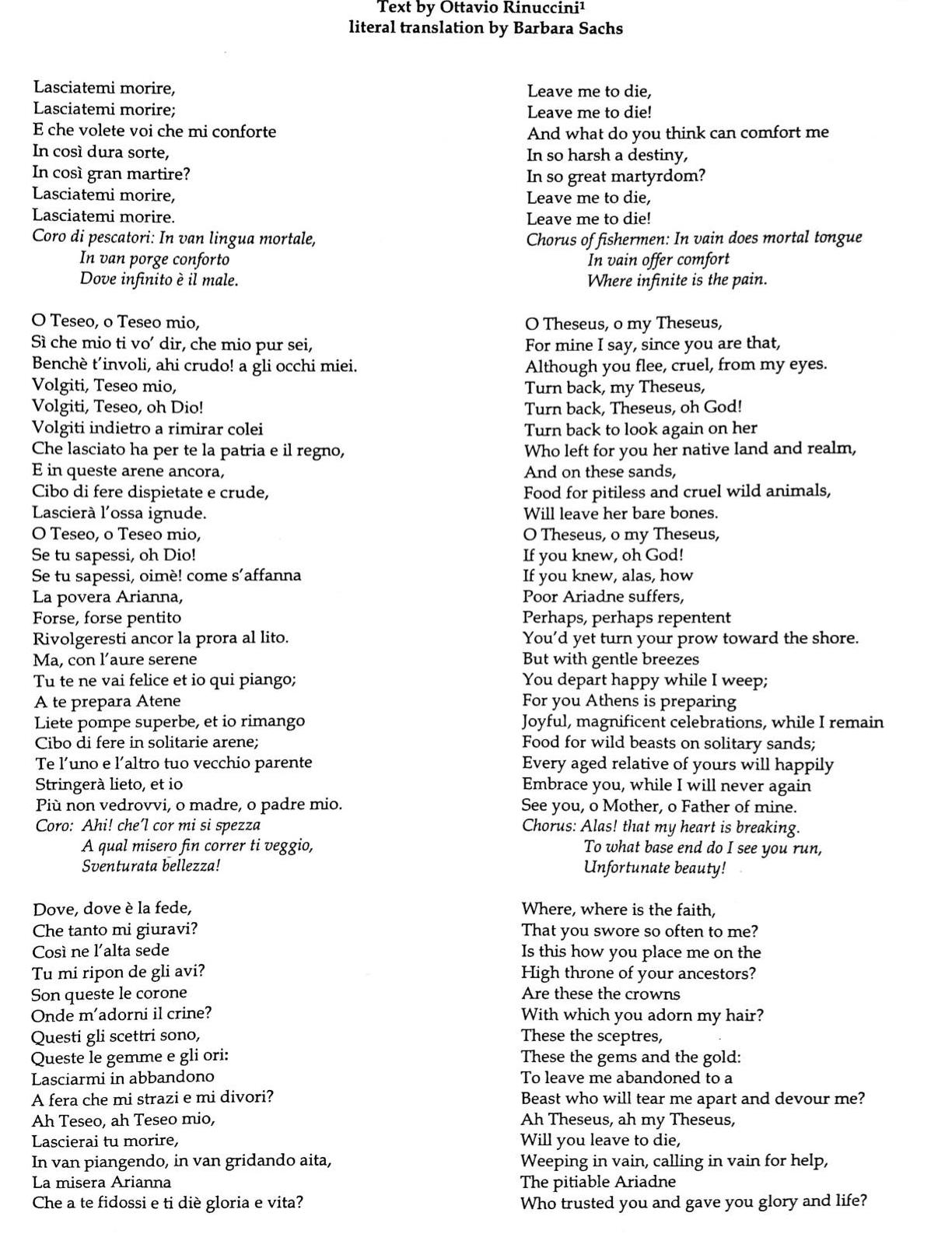 Dove, dove è la fede che tanto mi giuravi?.../...la misera Arianna che a te fidossi e ti diè gloria e vita? = Where, where is the faith, that you swore so often to me?.../...the pitiable Ariadne who trusted you and gave you glory and life?