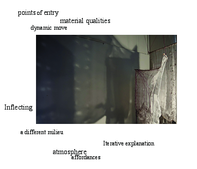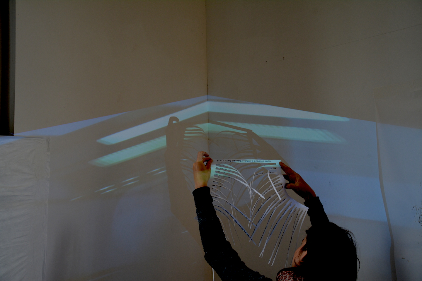 In-formation, as a process of formation in process relies on the specific activations that a situation affords, or the way that intensities and resonances become felt across heterogeneous elements. Such elements are the shaping, activating movements in research-creation, which move between conceptual, embodied, gestural and material domains.
