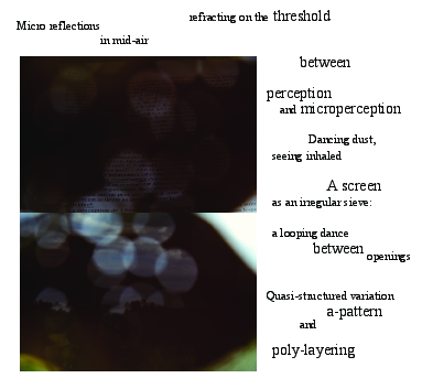The Milieu traverses these two definitions that locates it at the center or the peripheries. The milieu is not localizable; it doesn’t have an origin. It is a line, it is an axis. It is a canal, it is a flux. It is a consistency, (or perhaps a texture?) that opens to movements and its dynamics. The milieu is this “space” or hole where the things are brought to present, animated transformed.