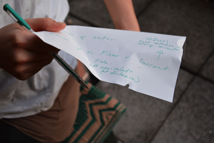One important technique carrying us through the series of workshops and events are the movement profiles. We initiated a process of tracing, interlacing and relaying movements between different geographies, materialities, and realms of thought. It might be interesting to continue movement profiles, now attuned to water. This feeds into the question of a trans-local urban fabric resonating through our specific live-worlds or milieus and their shared ground.