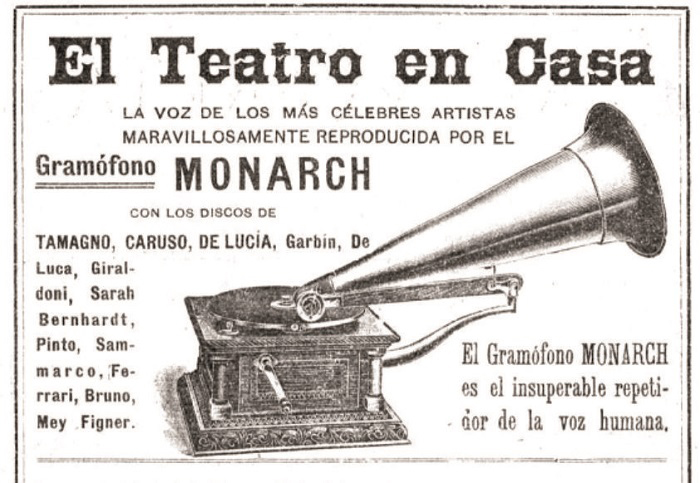 This communication is followed by a series of institutional greetings, conversations between individuals, music, and the singing of a verse and chorus of the national anthem. The telephone was introduced and made available for remote communication in 1881, when telephone services started being available for the population. This marks a first contradiction with the nature of sound: “Once telephones, phonographs, and radios populated our world, sound had lost a little of its ephemeral character” (Sterne 2003: 1). Due to the desire for international, technological innovations, phonographs and gramophones, which allow for reproducing sounds, stored in cylindrical and disc-shaped formats, begin to show up in Buenos Aires’ markets. The “captive sounds” in these mobile formats transformed the sonic into a commodity in a surprising way, as it is expressed in an advertisement of a listening room at 220 Florida street in 1900: “Who would have imagined that sounds would become interchangeable articles just like any other merchandise!”