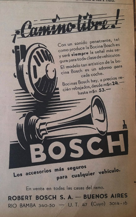 Figure 11: “Free way!” This advertisement highlights the value of horns with a penetrating sound. It is one of the many publications that offer horns with various intensities and tones. This shows a contradiction with the municipal norms establishing the sonic characteristics a horn must have, and its use as final resort (image from a “Bosch” advertisement 1936).