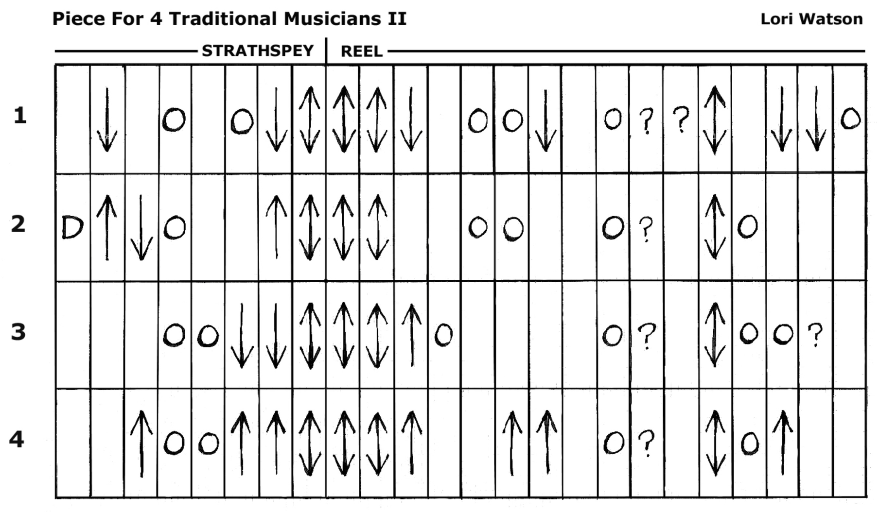 In the Team A workshop, which lasted approximately two and a half hours, the three original scores for Pieces for Four Traditional Musicians were explored in rotation through performance ‘takes’ interspersed with discussion. In total, Team A performed four takes of Scores I and II, and three takes of Score III.