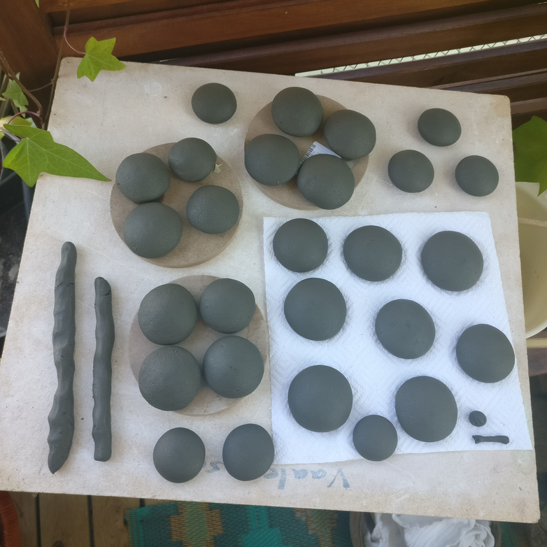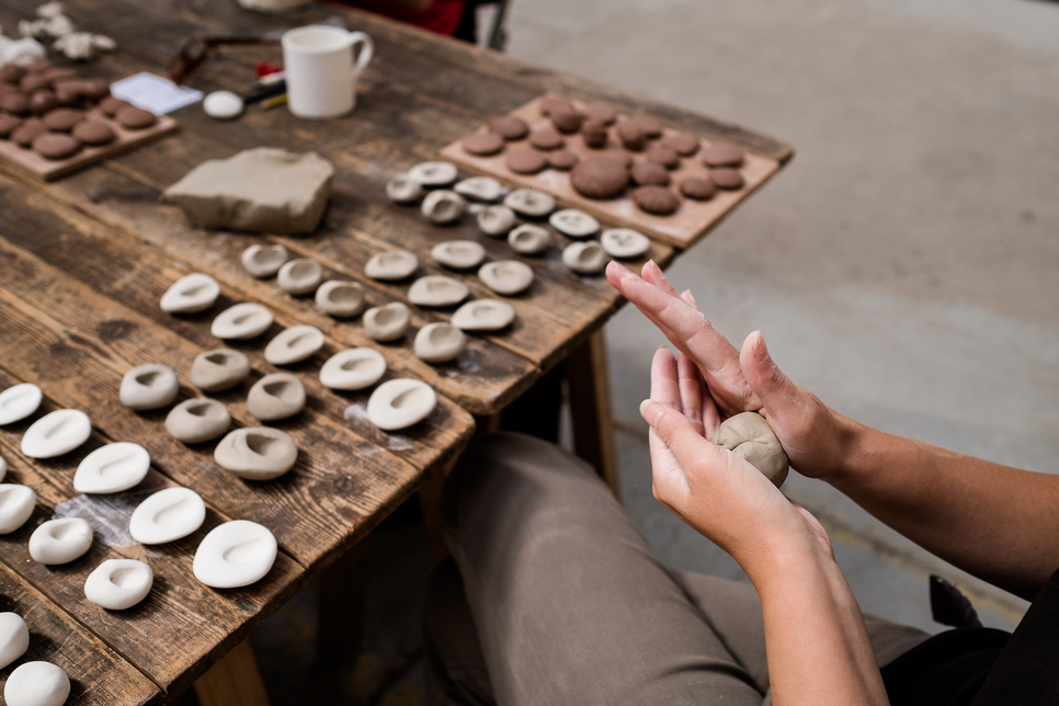 Making pebbles out of the natural clay. These pebbles were used as ´sensorial tools´in the Sensorial Ground boxes. Image: Priska Falin, 2020