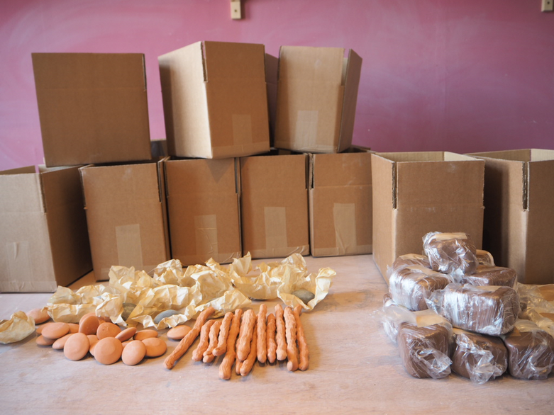 Sensorial Ground boxes were posted to each participant containing: Practice Intentions, General weekly overview, Sensorial tools (pebbles and stick), Etruscan Red clay and Porcelain. Image: Helen Felcey, 2020