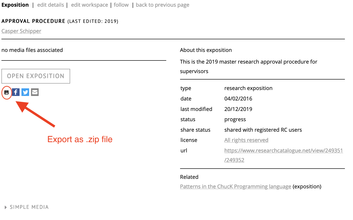 For offline reading, expositions can be downloaded by using the export function, which can be found on the META page of the exposition (available through the link on the top right). On this meta-data page, click the floppy disk icon to download:
