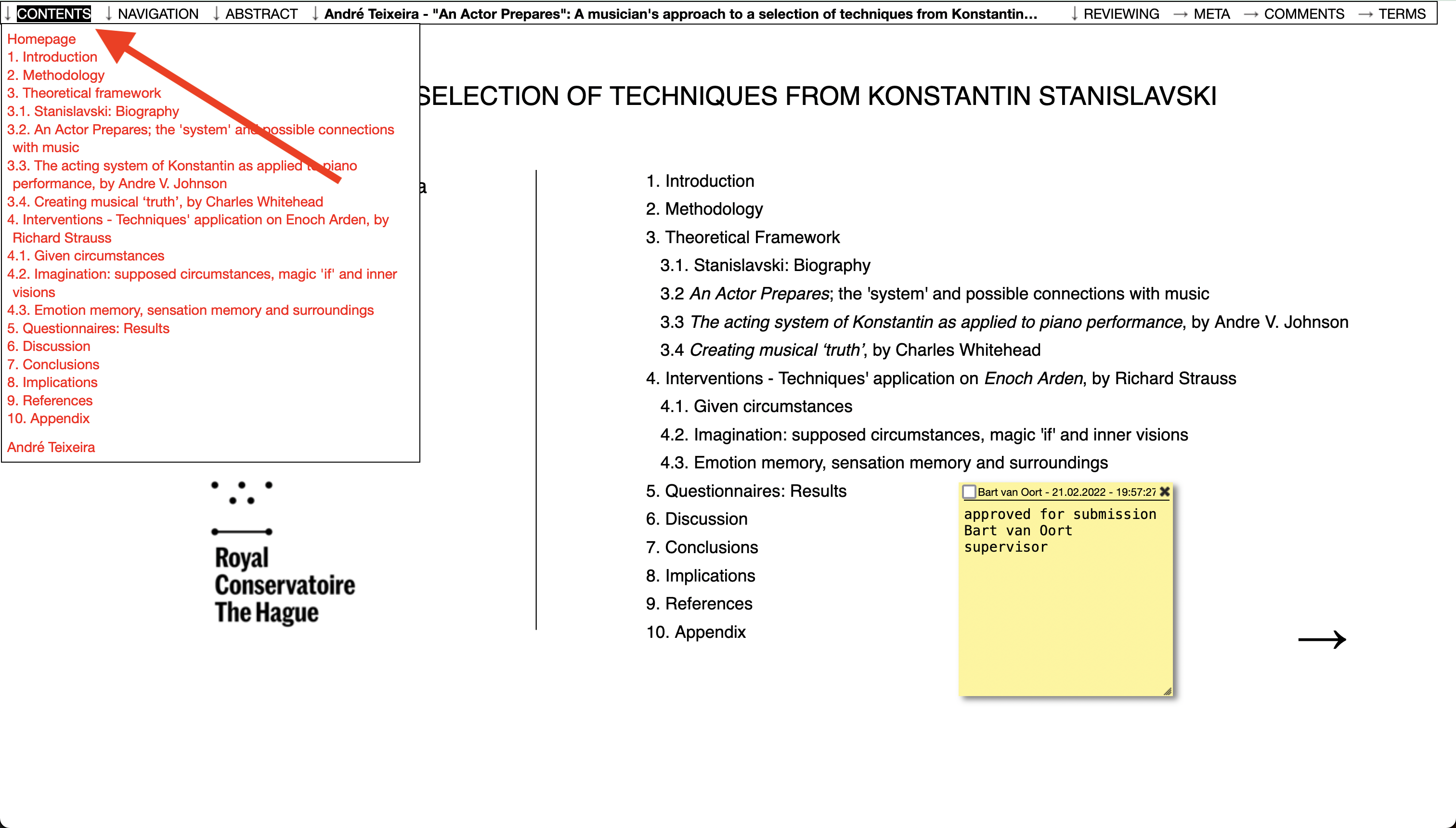 an editor by which these documents can be connected and arranged in such a way to form an ‘exposition’ of the research, i.e. to form an (artistic) argument. The research catalogue format has been designed to move beyond the limitations of pdf or text based formats and supports integrating elements of practice (by means of video or audio fragments) into the documentation. It allows students to demonstrate findings instead of merely illustrating.