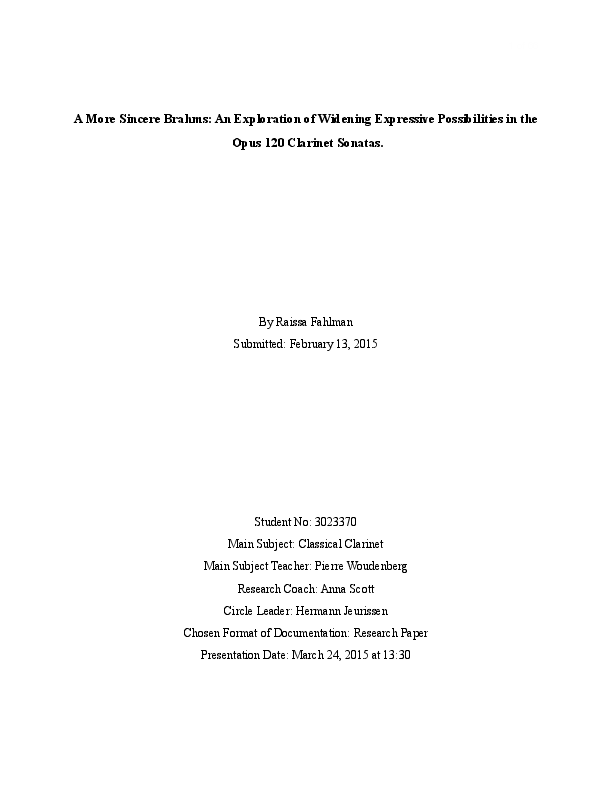 Name: Raissa Fahlman Main Subject: Classical Clarinet Research Coach: Anna Scott Title of Research: A More Sincere Brahms: An Exploration of Widening Expressive Possibilities in the Opus 120 Clarinet Sonatas. Research Question: What might documentary and sounding evidence of the performing styles of Johannes Brahms and his contemporaries reveal to modern performers about amplifying expression via increased tempo flexibility in Brahms’s Opus 120 Clarinet Sonatas. Given this evidence, what ideological and practical factors might inhibit modern performers from incorporating this evidence in their own interpretations today? Summary of Results: The exploration of documentary and sounding evidence relating to the performance style of Johannes Brahms and his contemporaries reveals much to modern performers about the difference in performance styles between the nineteenth century and our own. The documentary and sounding evidence examined in this research project demonstrates that Brahms and his contemporaries played within a much wider spectrum of expressive possibilities, revealing more accelerandi, ritardandi, and independence between voices, than our controlled modern interpretation of Brahms would allow. Ideological and practical factors however discourage modern performers from implementing this evidence into their own performances: pressures of fidelity, authenticity, text-centricity, and the diminished role of performers as compared to composers have all contributed to the constant scrutiny of performers' interpretative choices, and have increased the risks associated with performances viewed as expressively licentious. Practical application of this research via documented performance experiments however shows that modern performers can, when aware of the above historical evidence as well as the ideological pressures they face, implement stylistic tools from the past into modern interpretations of Brahms's works. For my own performances of the Brahms Opus 120 Sonatas, this research project has informed my interpretation, resulting in recordings of increased fluidity of phrasing, a more expansive range of expressive freedom, and an overall stylistic shift towards greater artistic freedom and a natural interpretive flow that is less hindered by societal pressures. My recordings also demonstrate that this research is not only relevant within the Opus 120 Sonatas, but transferrable across all of Brahms’s music. The goal of this research is not only to expand expressivity in my own performances, but to offer this evidence to other performers who may struggle with the question of expressivity when performing Brahms as well. Biography: Raissa Fahlman is a devoted clarinet soloist, chamber and orchestral musician. She has participated in several world premieres as a member of chamber ensembles, large ensembles and as a featured soloist. Recent musical commitments have included two Long Term Creative Music Residencies at the Banff Centre in Alberta, Canada, where she was an Artist in Residence. Raissa is an alumni of the University of Calgary where she graduated with distinction with a Bachelor of Music degree, and was awarded for excellence in her musical study by twice receiving the XL 103.1 Newcap Award in Music, as well as numerous scholarships for academic excellence. She is currently a masters student at the Koninklijk Conservatorium in The Hague.