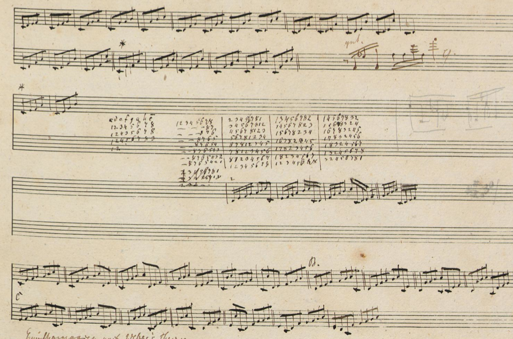 As an example of how these two modes are actually already both active in pianistic practice, see Schumann's sketch here to the right and consider what details need to be added to merely realize it in performance, and what other details could be changed in order to turn this sketch into productive practicing. Assuming that it was notated to assist his own practicing and not intended as a musical work, taking a similar approach to changing details in musical scores that do intend to convey a musical work opens up many possibilities towards realizing initial degrees of improvisation in performance.