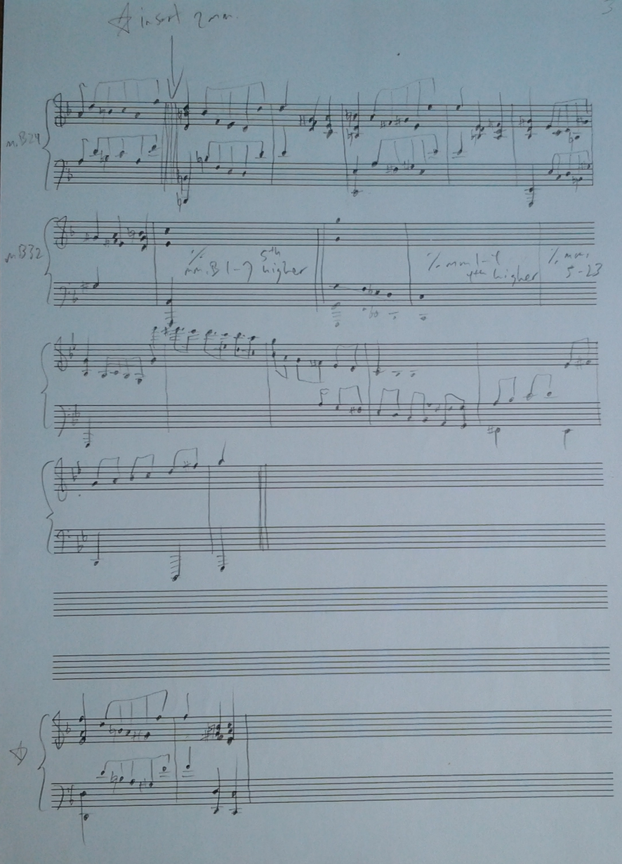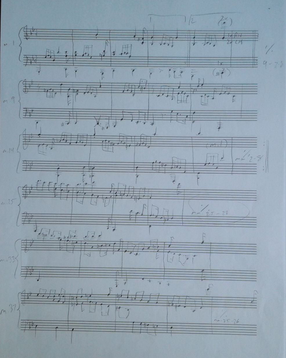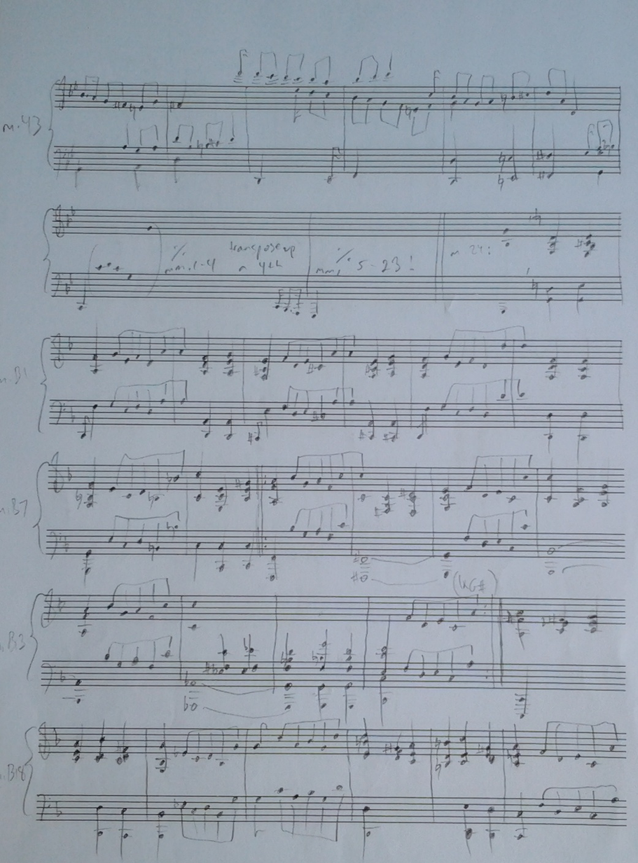 While superimposing the rhythmic and gestural characteristics of Kreisleriana No. V onto the harmonic structure of Kreisleriana No. VIII, certain decisions had to be made that proved to be too challenging to make only while playing. It became necessary to notate a manuscript of the music before learning to play it.