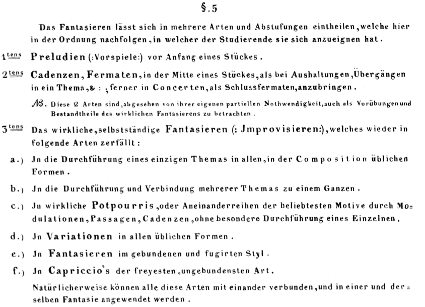Czerny calls extemporized performance “real improvisation” when the resulting music is not based on any specific score. In the fifth chapter of his Anleitung zum Fantasieren, he lists certain genres in which one could improvise in performance, including different categories of free fantasies.