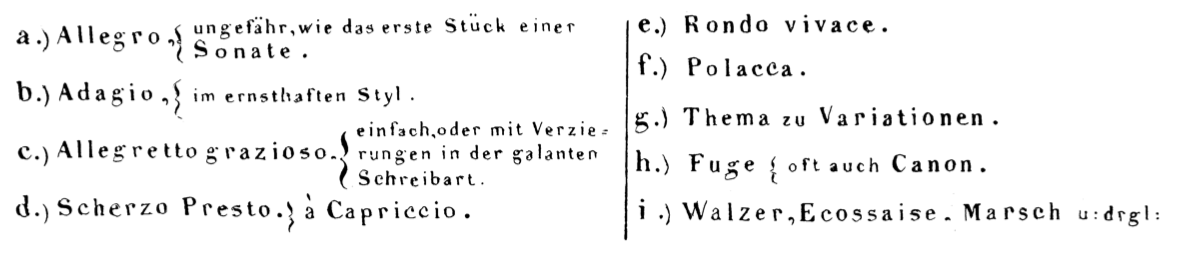 In the chapter where Czerny discusses improvising different genres of music using one theme, he provides another list  this time of different musical genres in which one should be able to improvise: