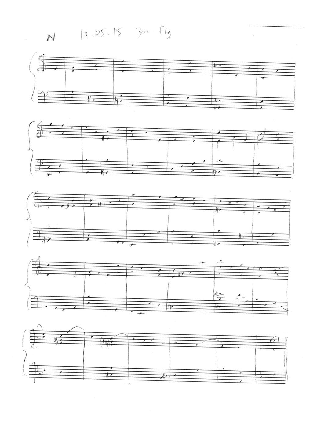 In an attempt to strengthen the quality of my melodic playing, I spent time away from the piano notating melodies. In a sketchbook dating from around December 2014, the first visible traces of Nachtgesang can be found – on the bottom stave of the page to the left and the top three staves of the page to the right (see below).