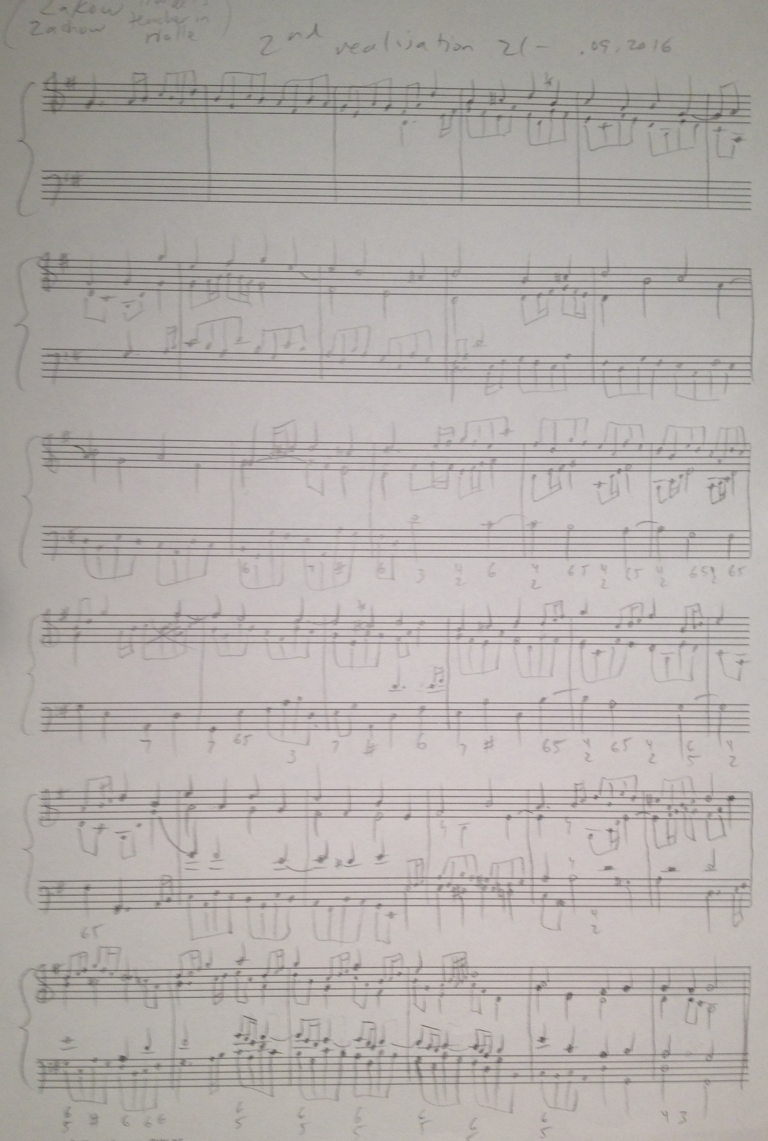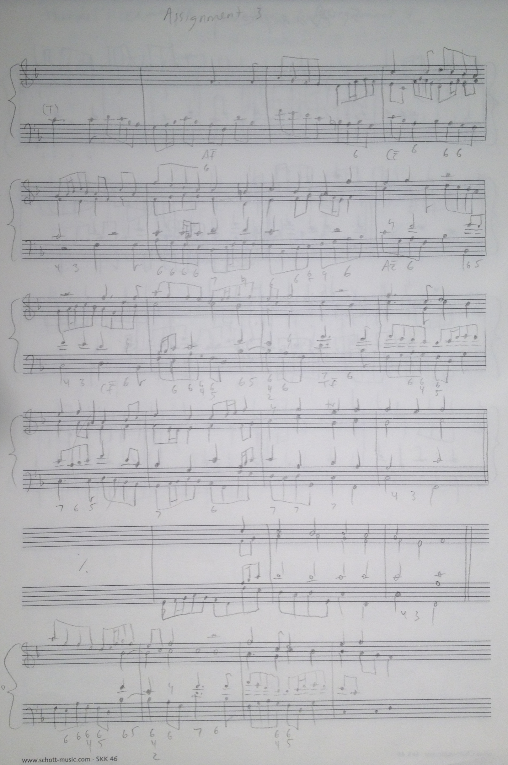 A notated transcription of Georgs Sonntag, written down after the performance, can be seen here to the right. Other attempts to improve my ability to deal with contrapuntal textures are displayed below: two attempts to set the melody Ein feste Burg ist Unser Gott in a contrapuntal manner and then my realizations of Handel's fugue exercises in his Lessons for Princess Anne.